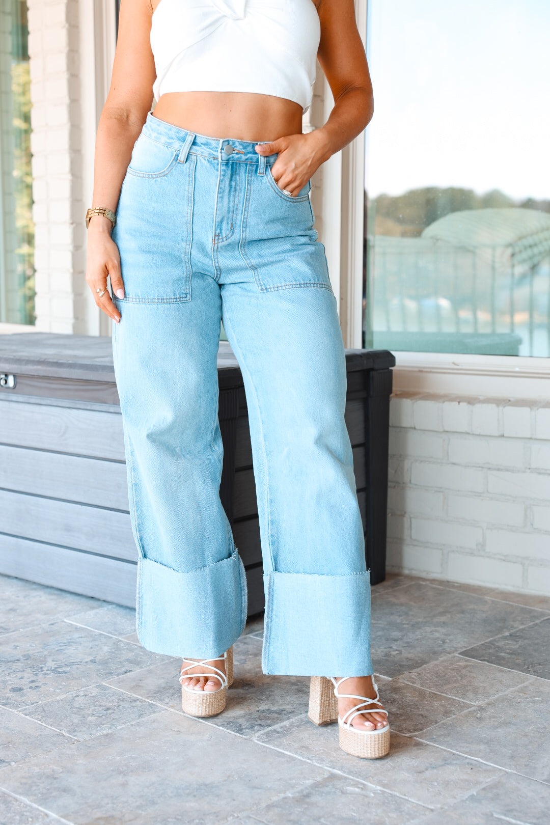 High Waisted Wide Leg Cuffed Jean- Lt Denim