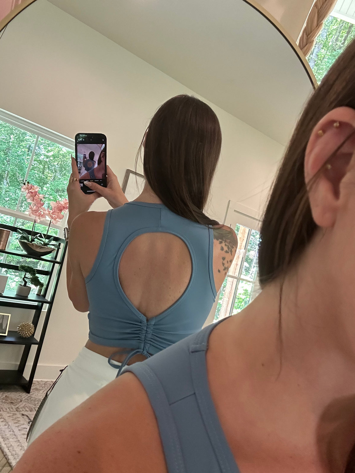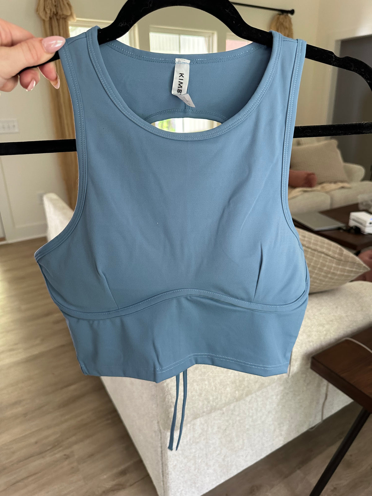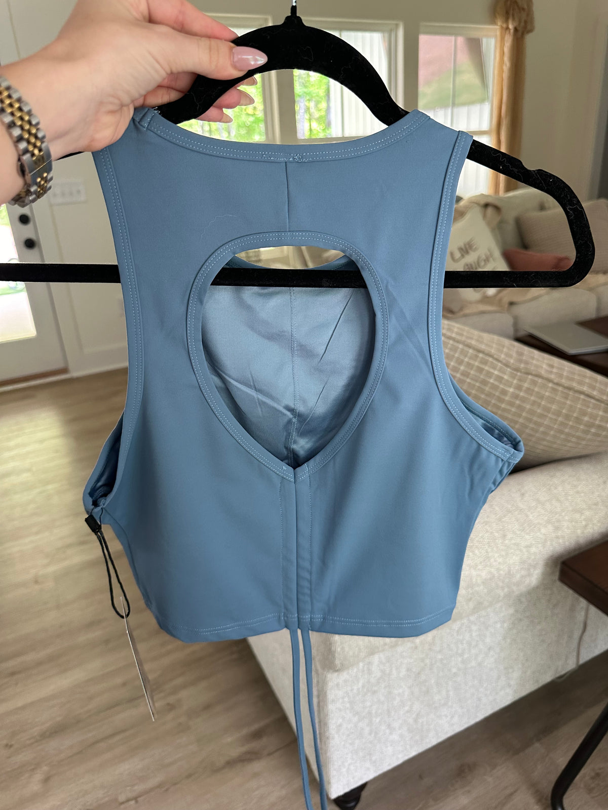 High neck, slim fitting tank with corset-style seaming details. Back cut-out with string tie detail. The material on this top is perfect.