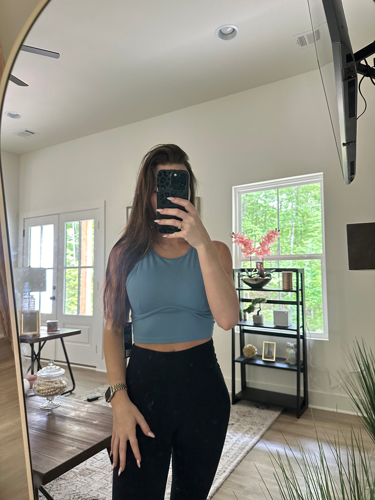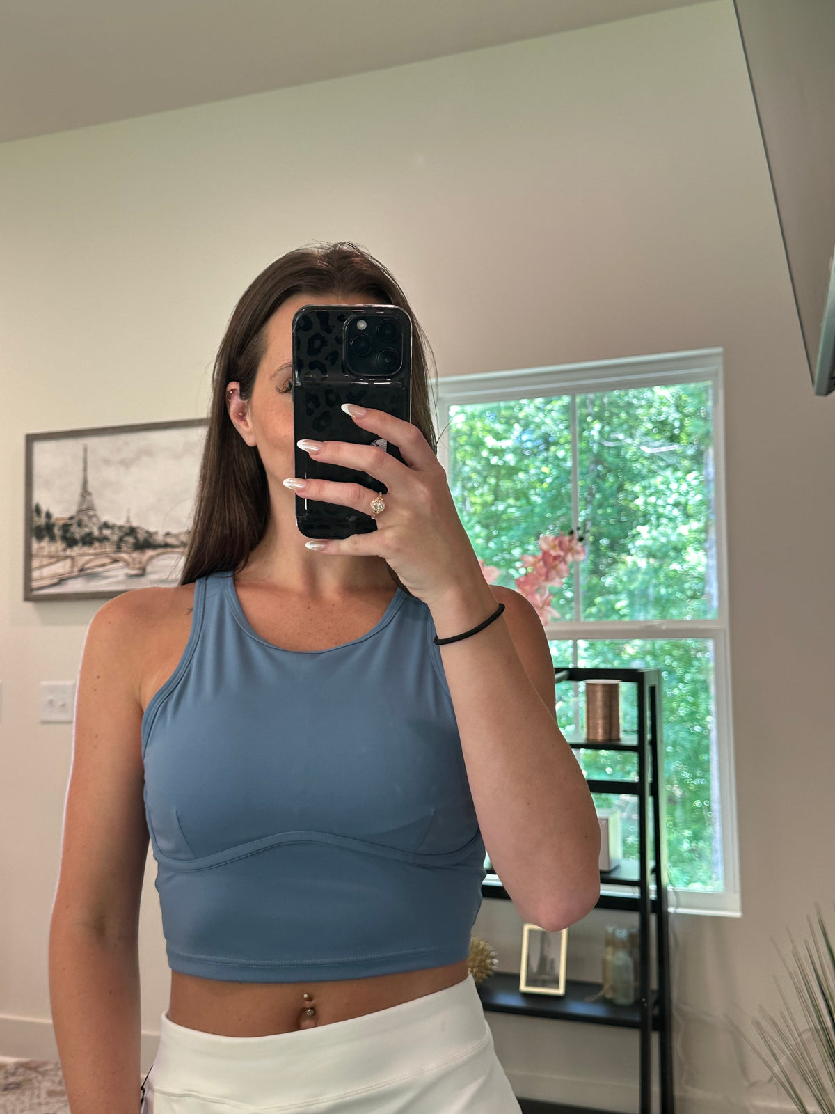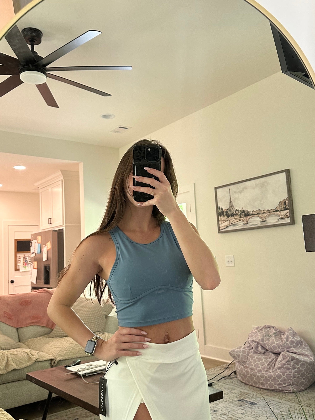 High neck, slim fitting tank with corset-style seaming details. Back cut-out with string tie detail. The material on this top is perfect.