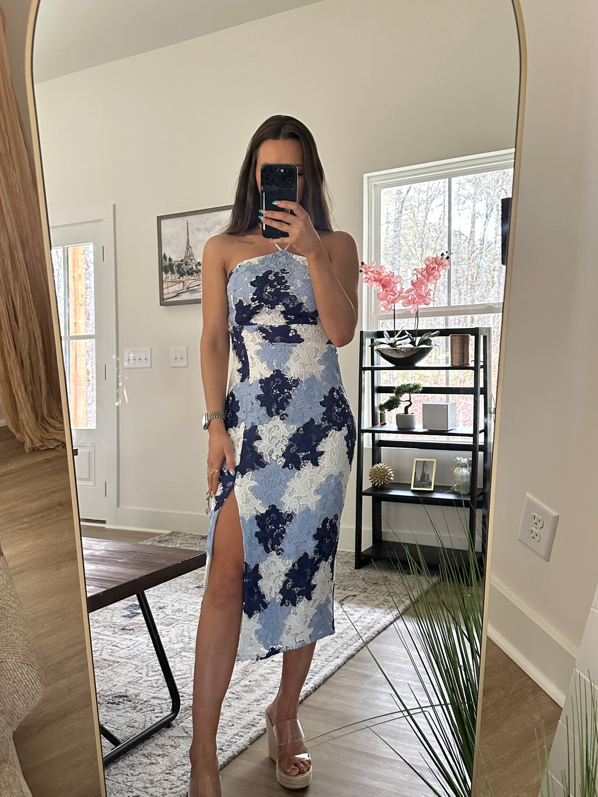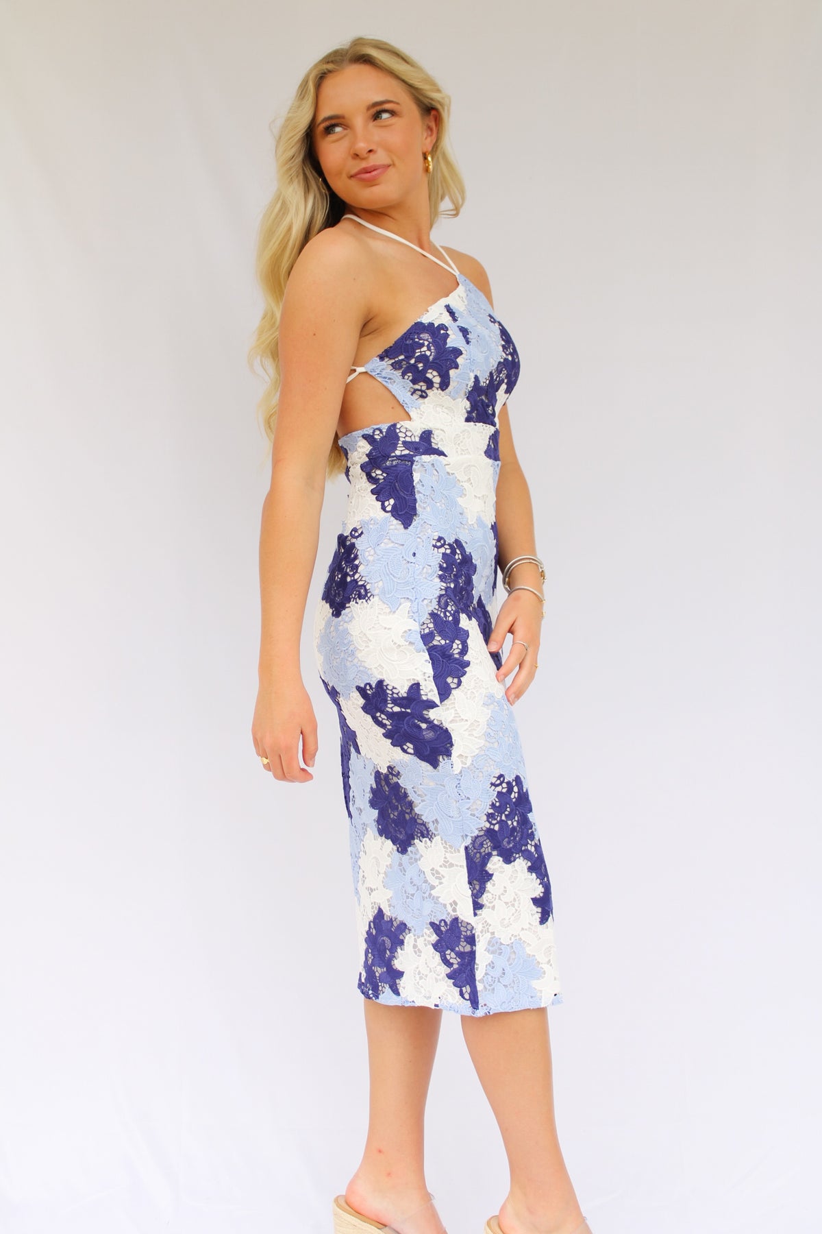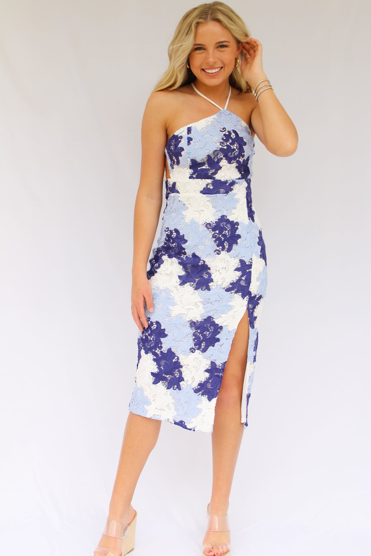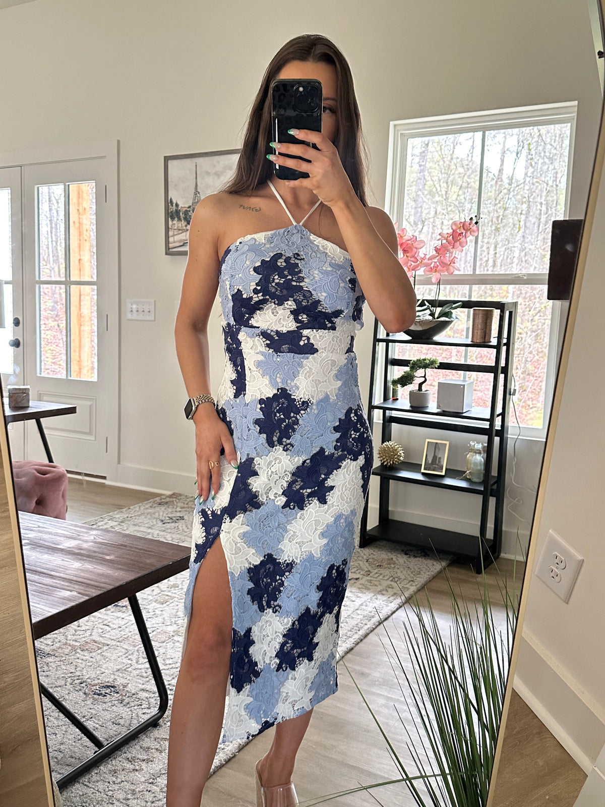 *Textured floral print, halter neck style, midi silhouette, subtle front slit & side zipper closure
