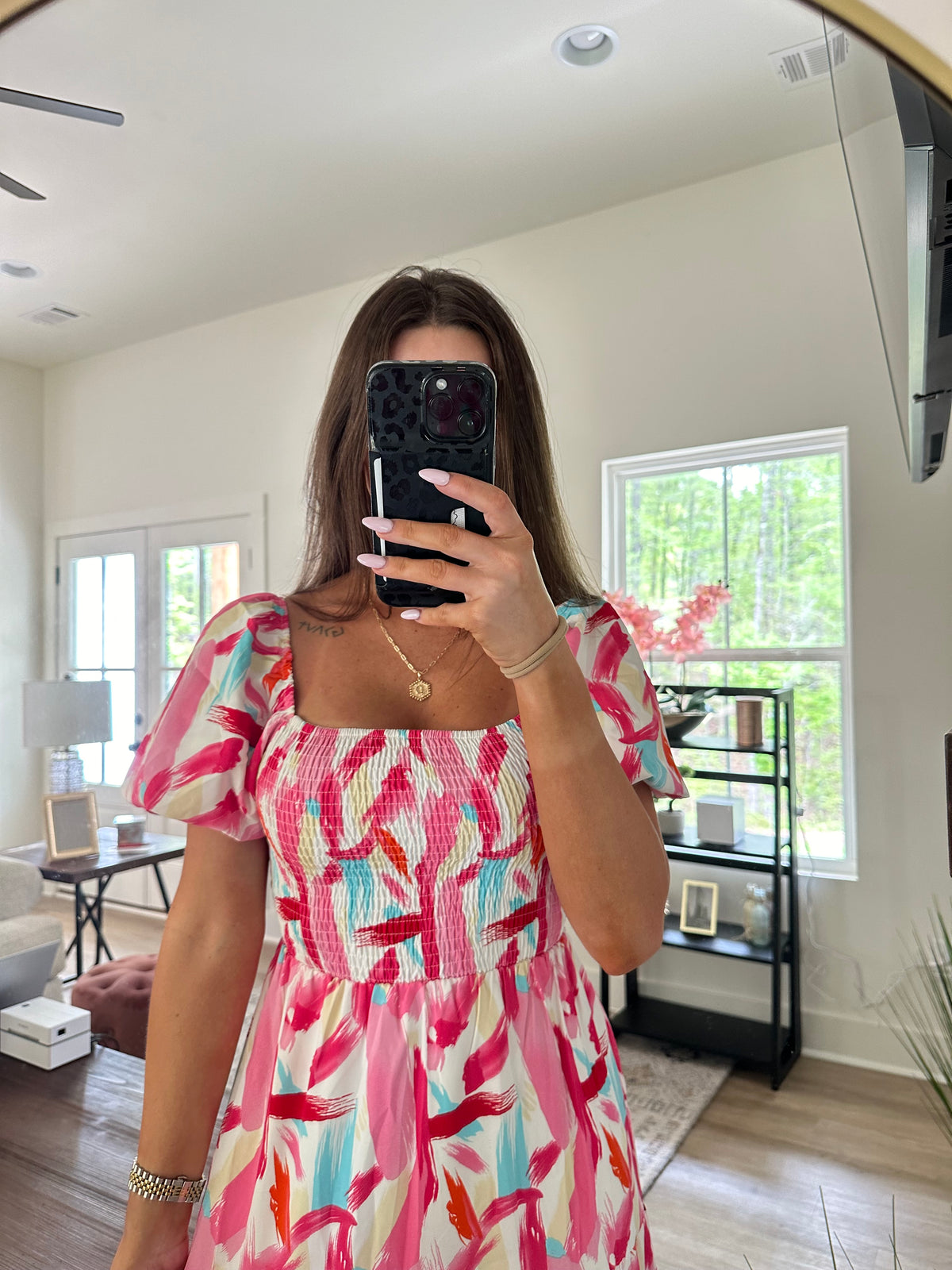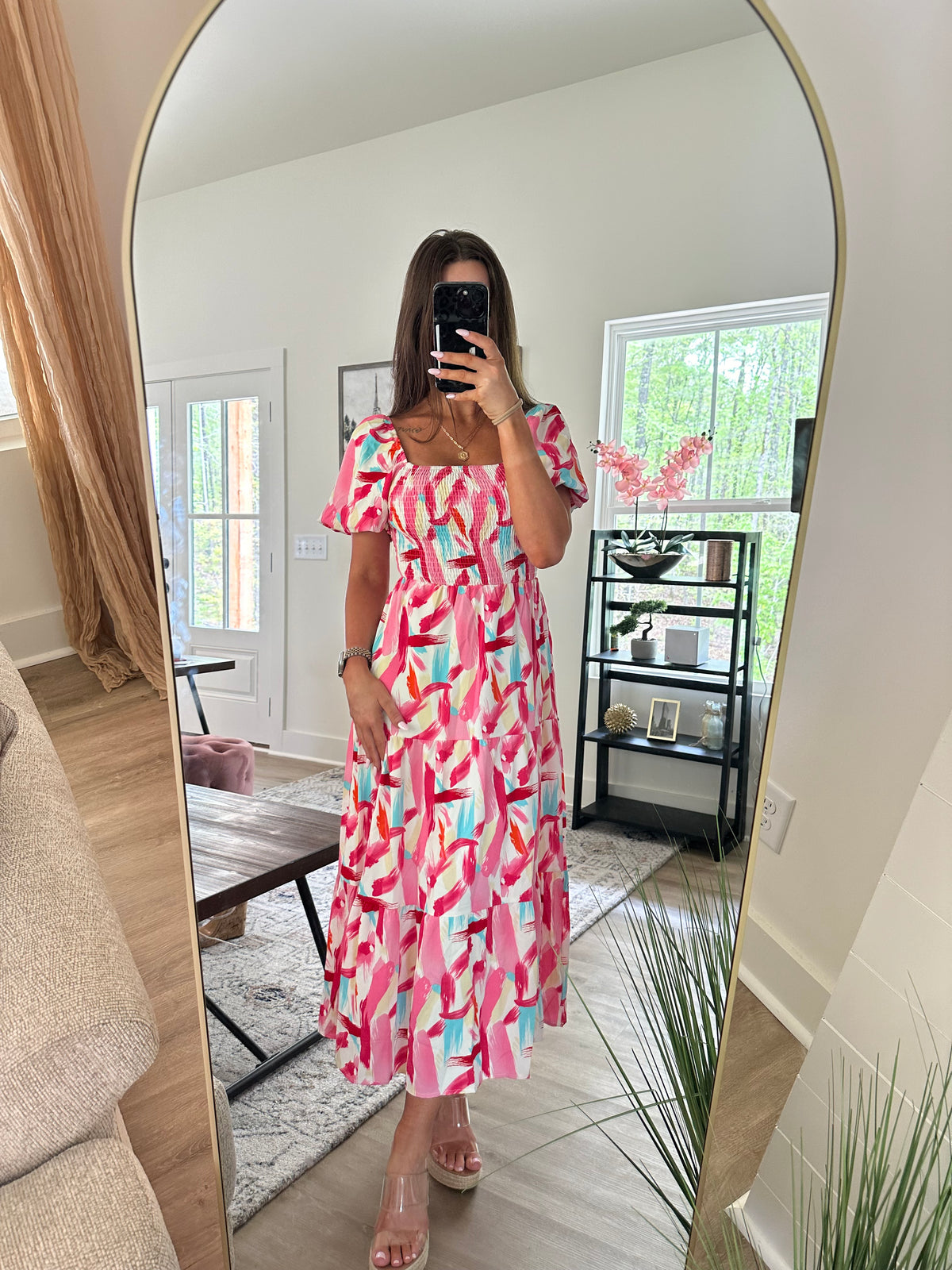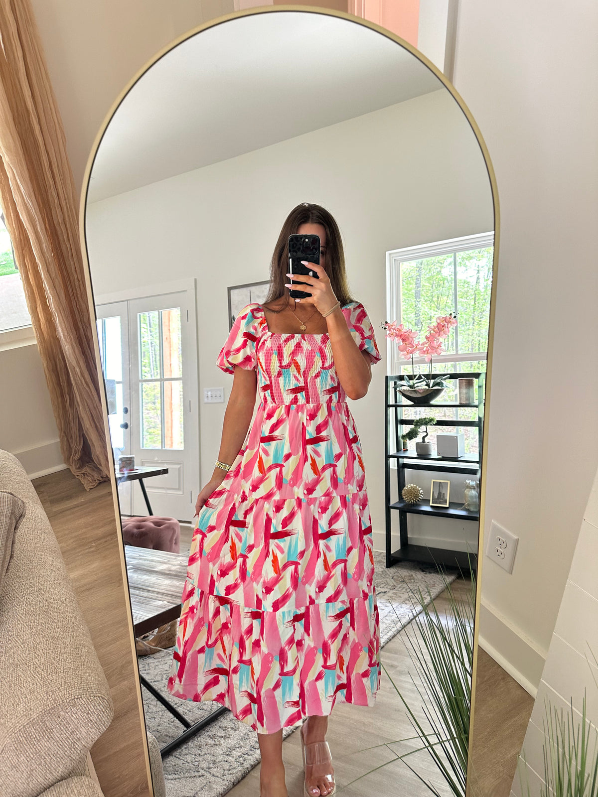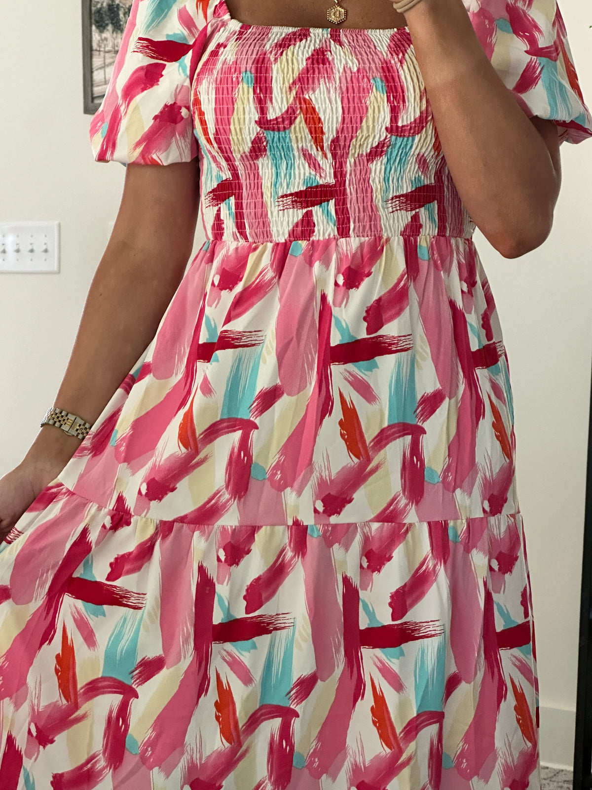 Effortlessly chic and playful, our Pink Brush Stroke Printed Smocked Ruffle Dress is the perfect addition to your wardrobe. The vibrant brush stroke print adds a colorful touch to your look. The flattering smocked bodice hugs your curves in all the right places and the square neck highlights women's charming neck line and collarbone.