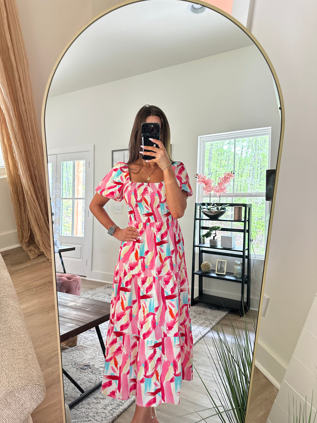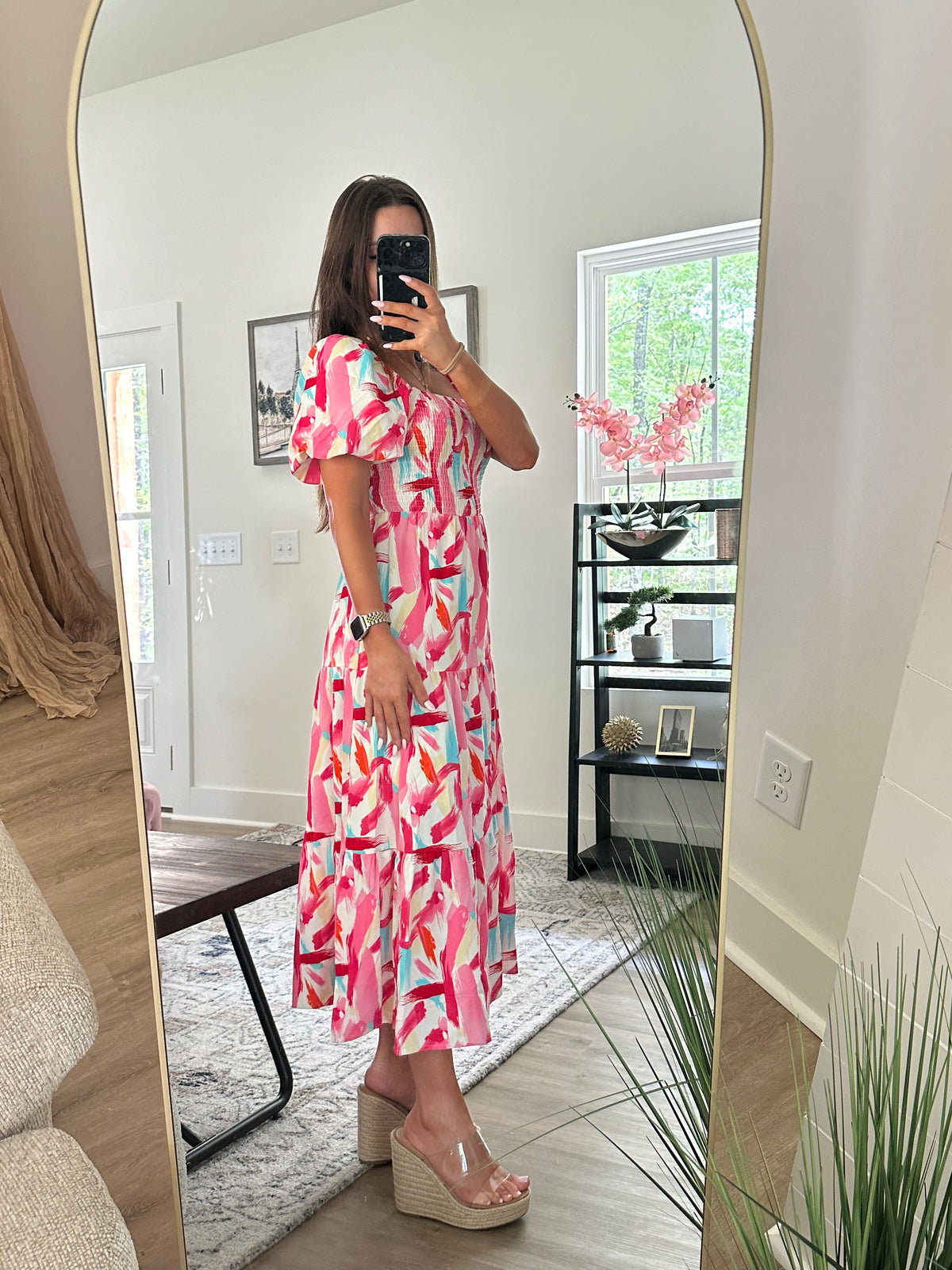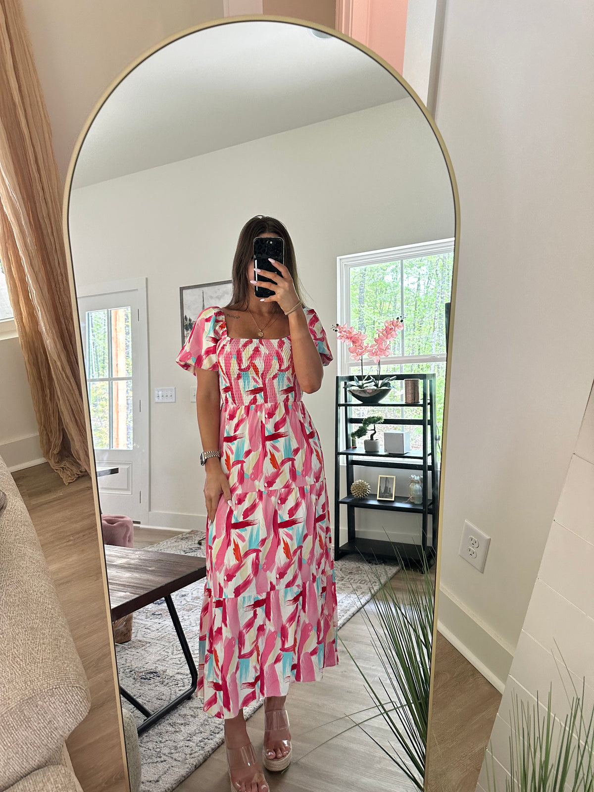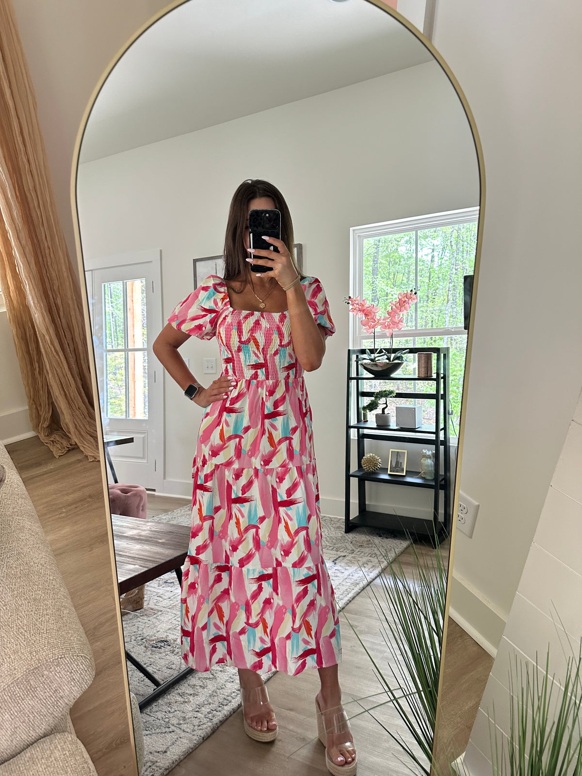 Effortlessly chic and playful, our Pink Brush Stroke Printed Smocked Ruffle Dress is the perfect addition to your wardrobe. The vibrant brush stroke print adds a colorful touch to your look. The flattering smocked bodice hugs your curves in all the right places and the square neck highlights women's charming neck line and collarbone.