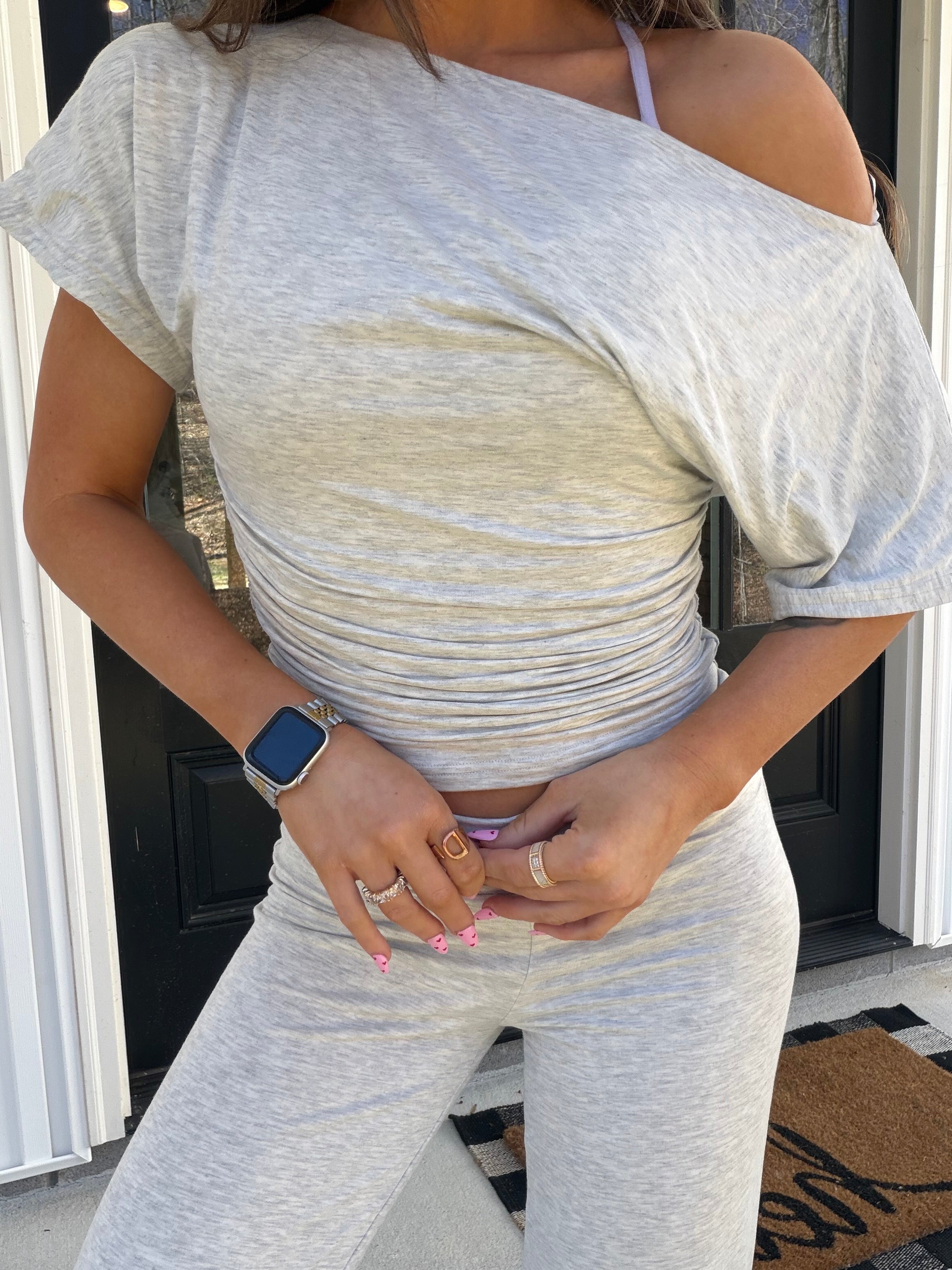 Rayae Asymmetric Slouchy Wide Boat Neck Off-the-Shoulder Top— Heather White