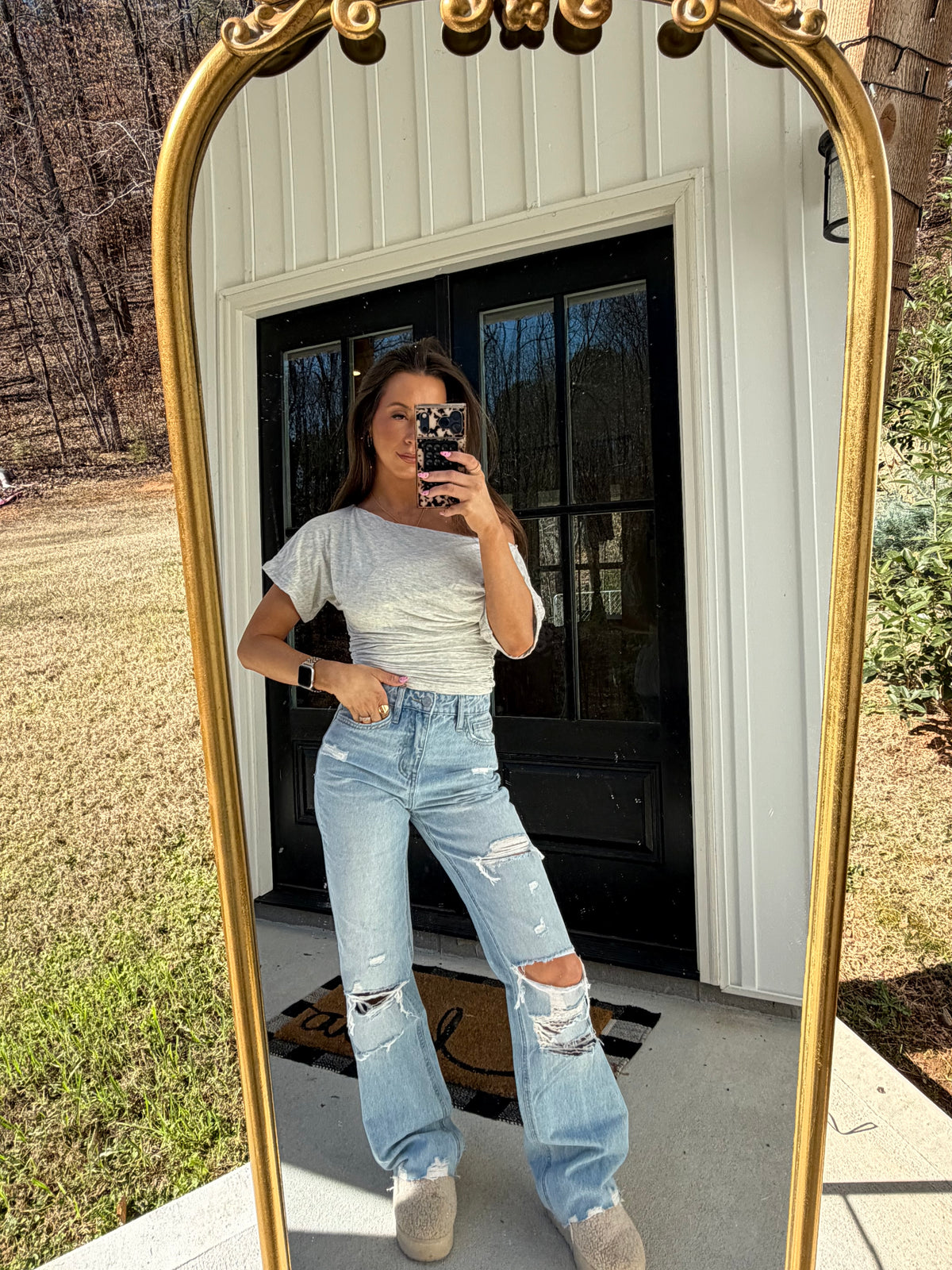 This asymmetric off-the-shoulder top features a relaxed slouchy silhouette with a wide boat neckline that can be worn on or off the shoulder. The subtle ruching at the waist creates a flattering, feminine shape while keeping the overall look easy and comfortable.