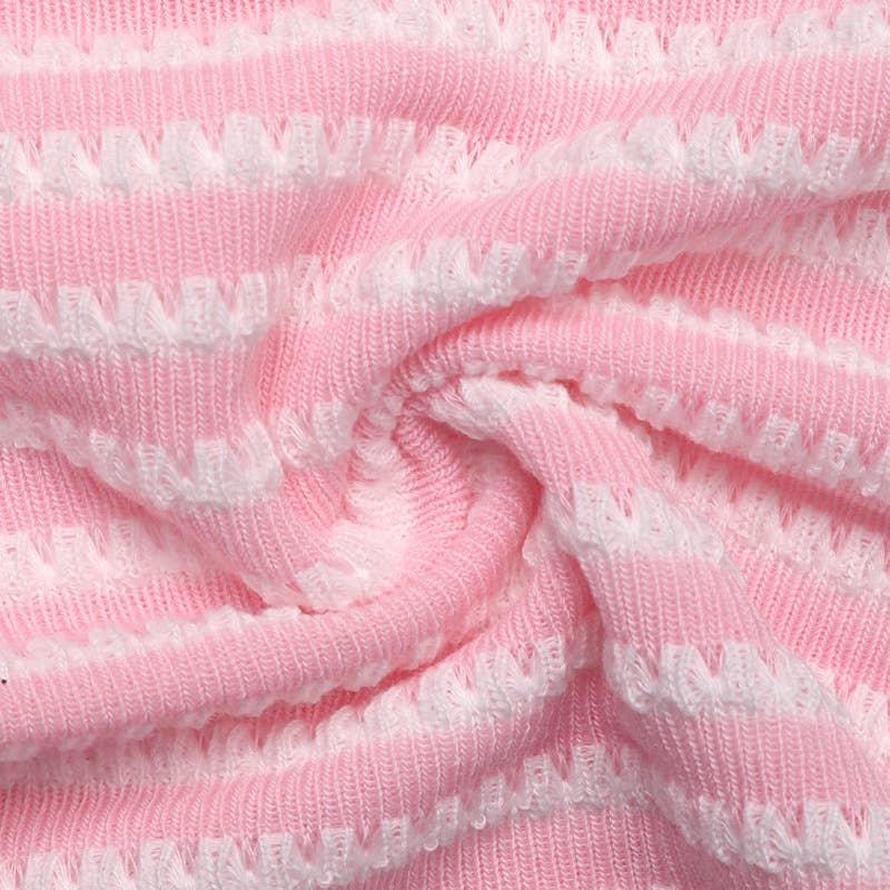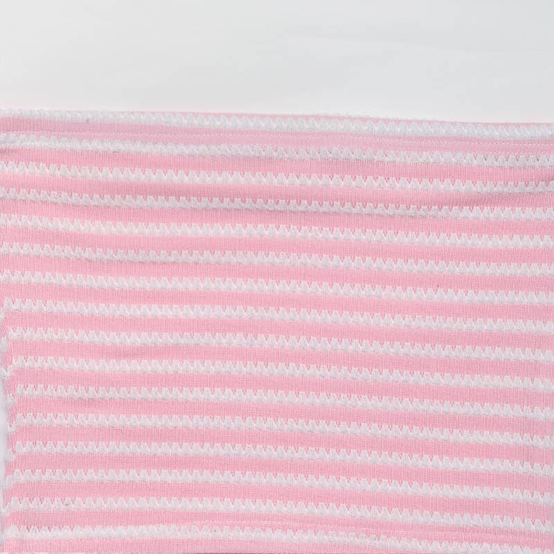 This Strapless Striped Knit Tube Crop Top in Pink features a strapless design and a striped knit pattern. This garment provides a seamless fit, ideal for layering or wearing alone. The breathable fabric ensures comfort, while the crop cut enhances versatility for various styling options.